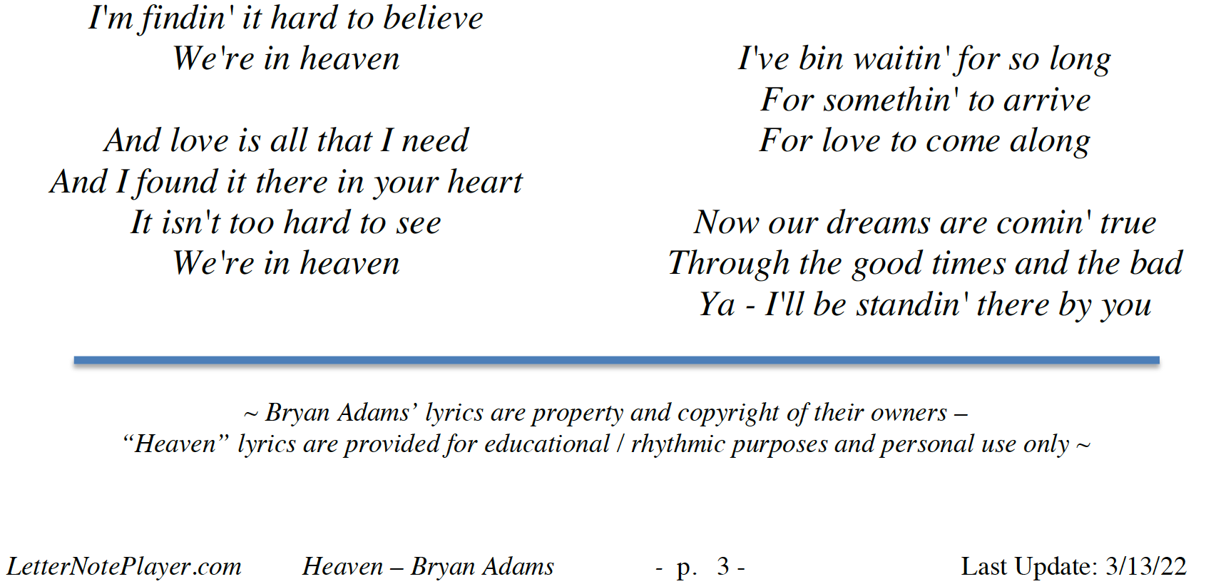 Heaven Sheet Music Bryan Adams Piano Chords Lyrics